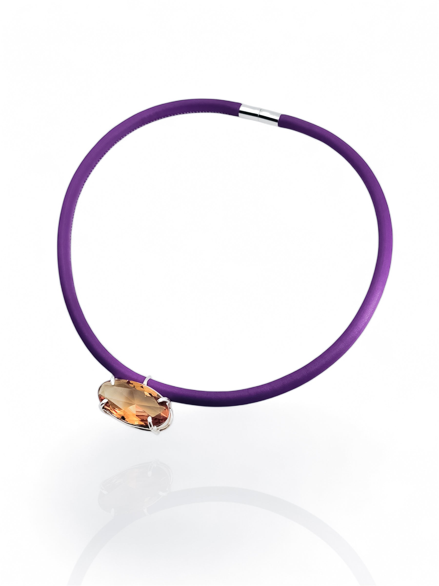 Necklace made from deep violet faux leather thread with a handcrafted 925 silver pendant set with a warm amber-colored stone.