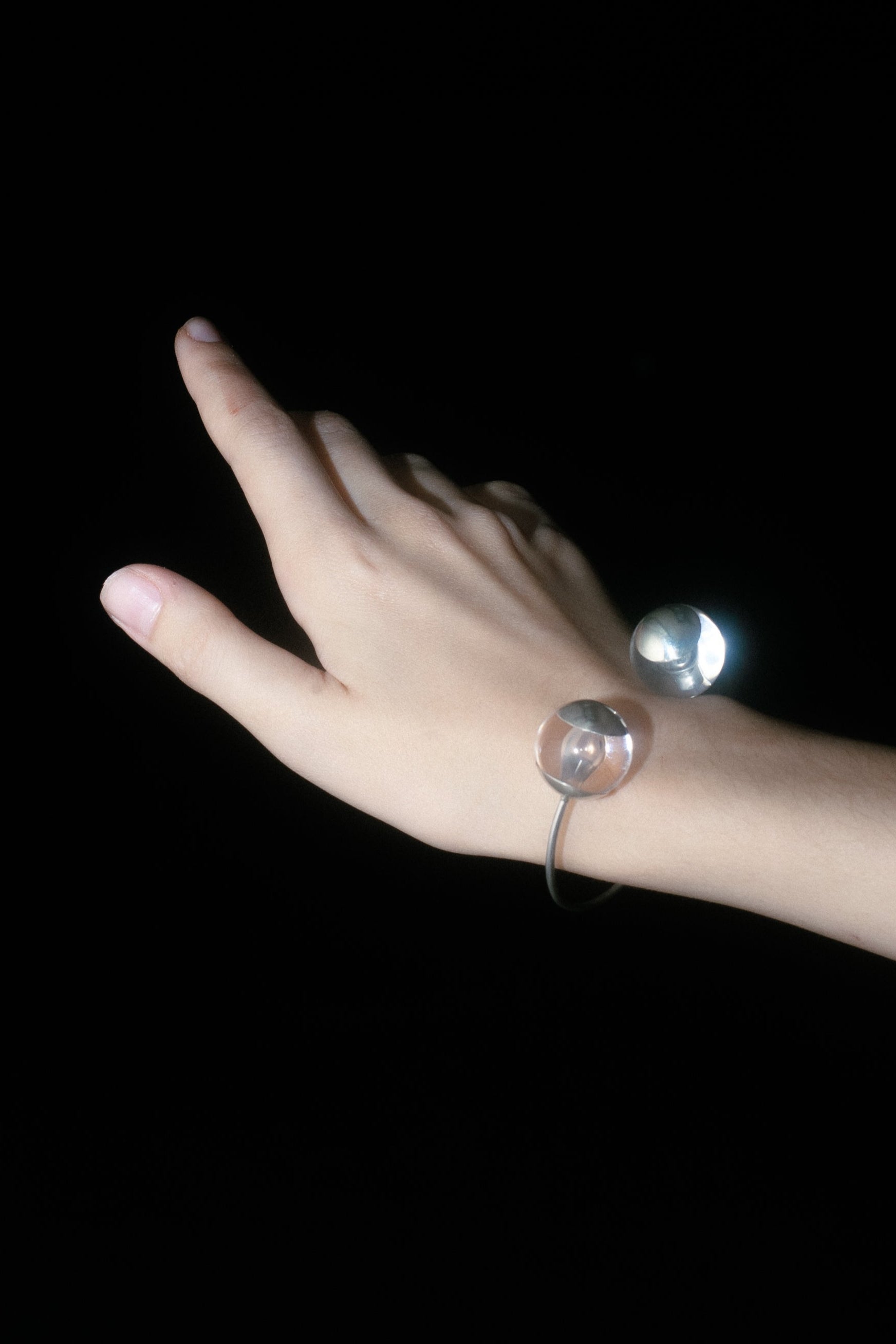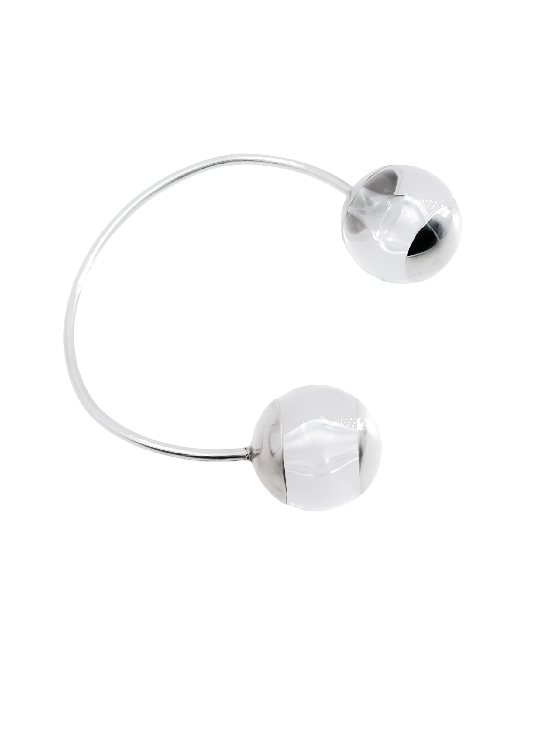 Handcrafted cuff bracelet made from 925 silver with two transparent acrylic spheres capped in polished silver placed at each end of the open band