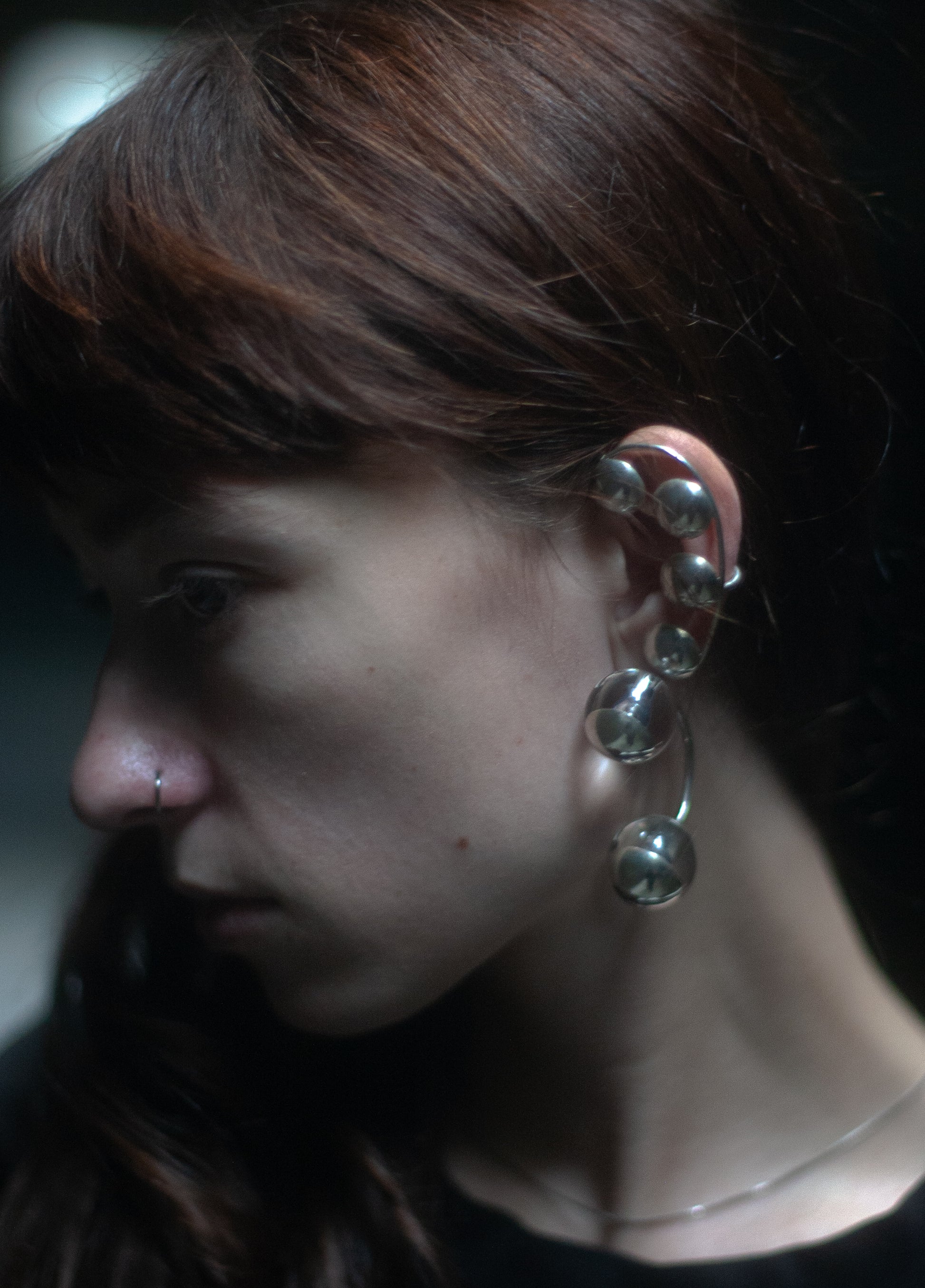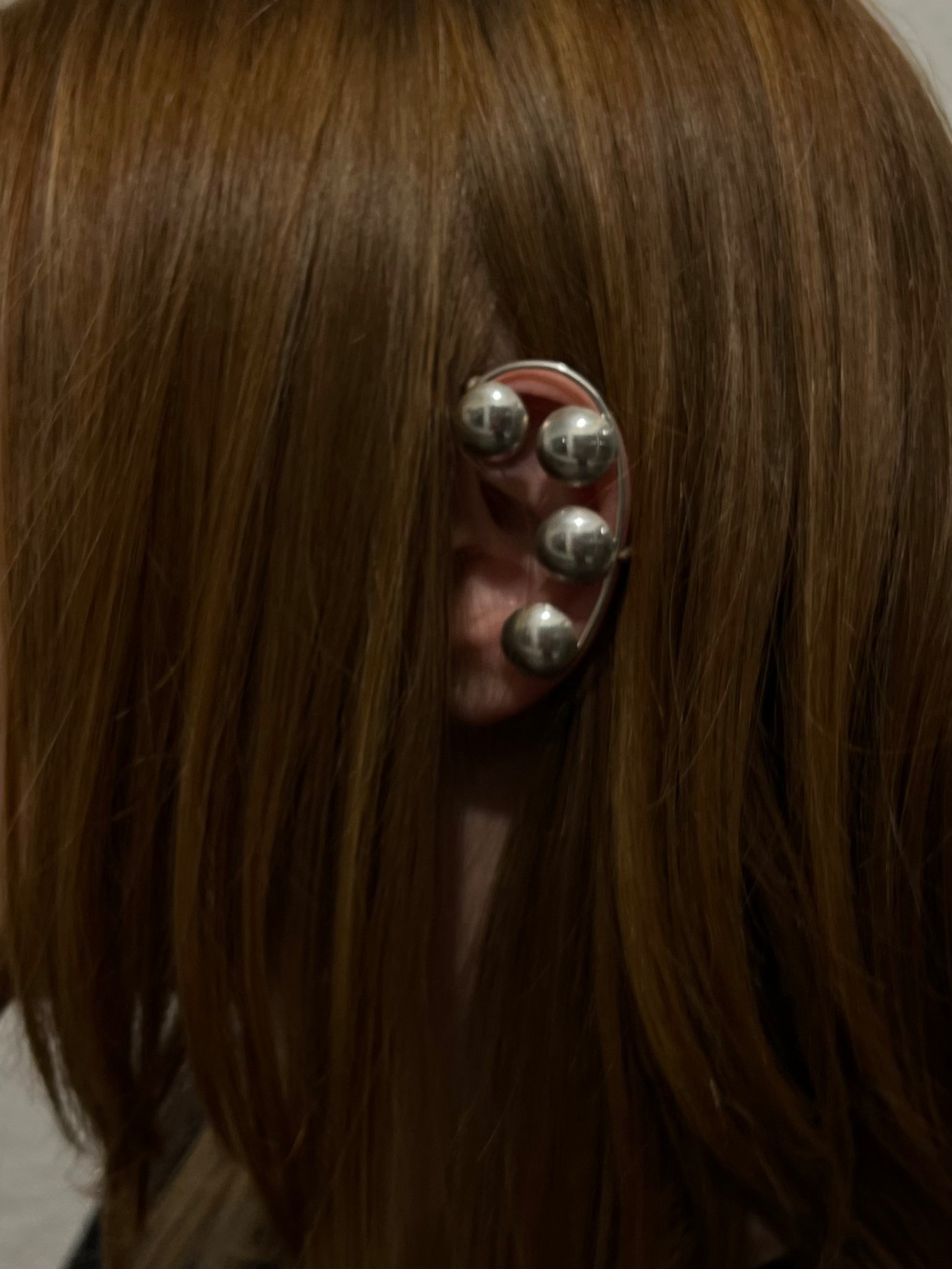 Handcrafted cuff bracelet made from 925 silver with four polished silver spheres arranged along a curved band, which symbolizing lunar movements